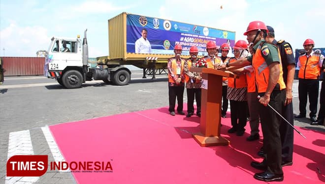 TIMES Kalsel/Gubernur Jawa Timur. Dra. Hj. Khofifah Indar Parawansa saat melepas ekspor komoditi pertanian di Terminal PetikEmas Surabaya (TPS). Kamis (21/3/2019). (FOTO: TIM Media For TIMES Indonesia)